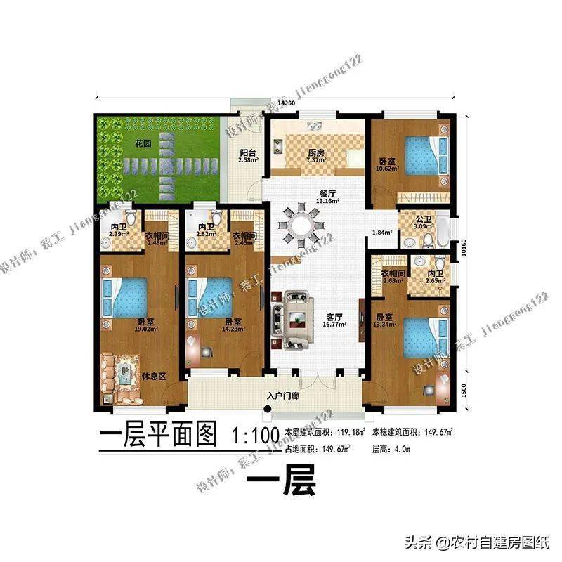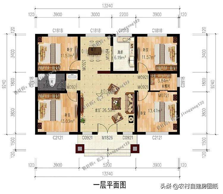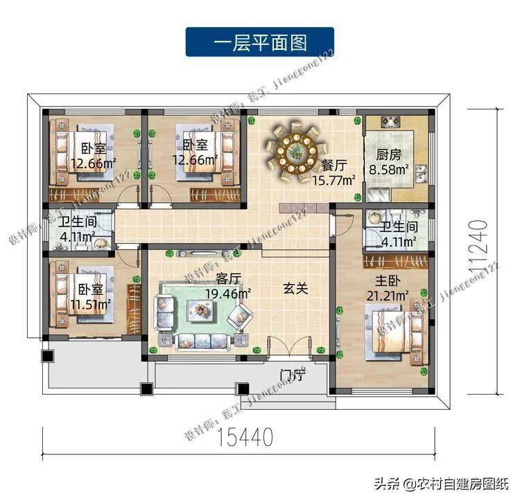 农村一层小别墅,经济大气,这才是农村房子该有的样子,户型时尚大气,造价经济,清新浅色的外墙搭配鲜艳的橘色屋顶,给人一种强烈的视觉对比感,门廊的设计增添房屋设计感。符合农村的环境和审美需求,入户是大客厅,可设计堂屋神龛。四间卧室偏居一隅互不影响,非常方便。