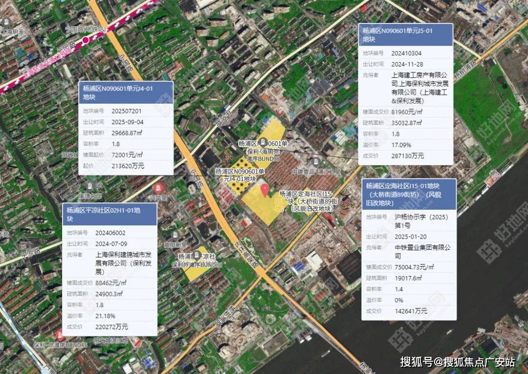 地块东侧,是今年1月20日,同样以协议方式出让的杨浦区定海社区I15-01地块(大桥街道89街坊),意向用地者为中铁置业集团有限公司,总价142641万元,楼面价75005元/㎡。