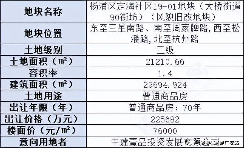 地块北侧是杨浦区N090601单元I4-01地块,出让面积16482.71㎡,容积率1.8,建筑面积29668.87㎡。地块起价213620万元,起始楼面价72001元/㎡。
