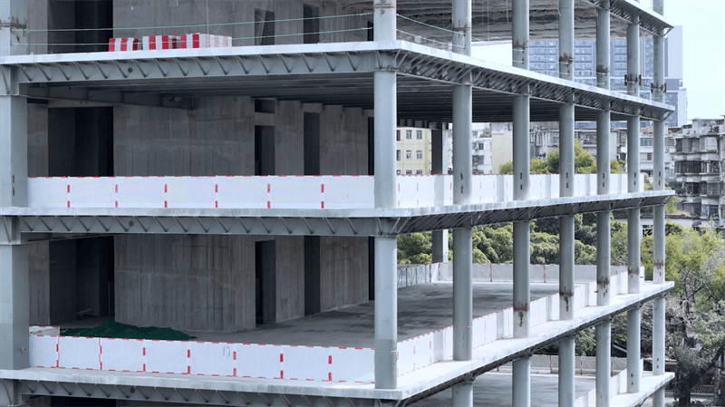 记者:这里就是项目规划建设的产业大楼A栋4层的工业厂房,这是预制钢管混凝土柱,顶部还可以看到预制钢梁、楼承板等装配式预制构件。尚总,这些构件是怎么来的?