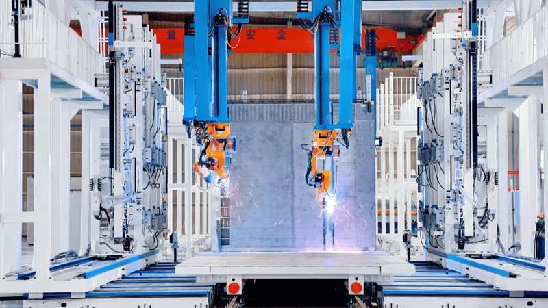 尚红行:这些构件是在智能建筑构件工厂的生产线上自动化生产出来的。现场通过塔吊把预制构件吊装到施工楼层,然后再进行拼装连接。