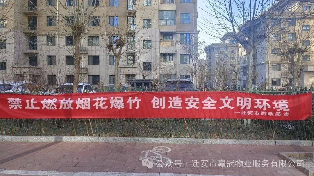 旧岁将辞,新程待启。热闹欢喜,佳节可期。根据我市市委和市政府的安全规定,我们提倡文明守岁。为确保小区安然祥和地度过新岁佳节,维护家园共同的美好环境。请大家遵守秩序规定,积极配合市政府统一工作部署。做到禁燃、禁放、禁烧,心中牢记文明安全、人人有责。少一点污染多一点清新,少一分危险多一份安全。携手共创文明城市,共建美好家园。让我们以新时代的安然,替代烟火的喧嚣,以和谐宁静的氛围、安静祥和的气息、紧跟新岁的脚步,安全、清新地迎接崭新的一年。