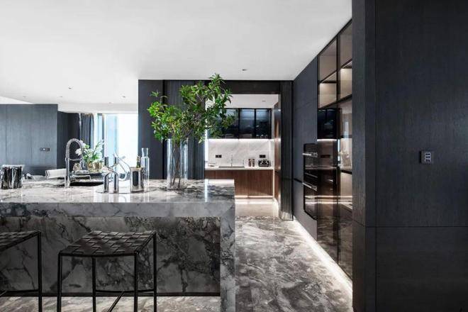 德国柏丽nobilia整体厨房,烤漆门板的选型为杭州壹号院量身定制,仿岩板色与深色木纹的搭配相得益彰,并加上柏丽的深色玻璃吊柜。定制设计中西双厨或开放式的社交厨房。巧思的细节设计,不论家庭互动还是会客聚友,都可以增加互动,社交无阻。