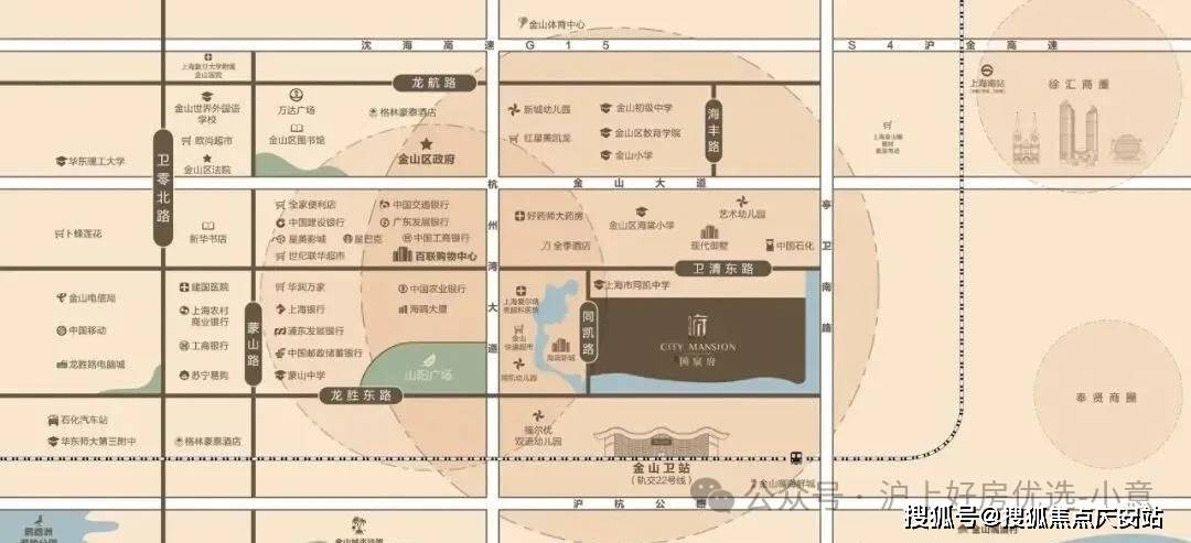建邦国宸府位于金山新城。金山新城是金山区的政治文化商业中心。金山新城拥有丰富的产业支撑,拥有两大4A级景区:城市沙滩、金山嘴渔村,其中每年都有很多盛事在城市沙滩举办,例如风夏音乐节、上海烟花节等。围填海项目的位置就在这一块区域,未来在金山卫站将建站一个53万方的TOD商业综合体,包含5星级酒店、写字楼、商业街等。