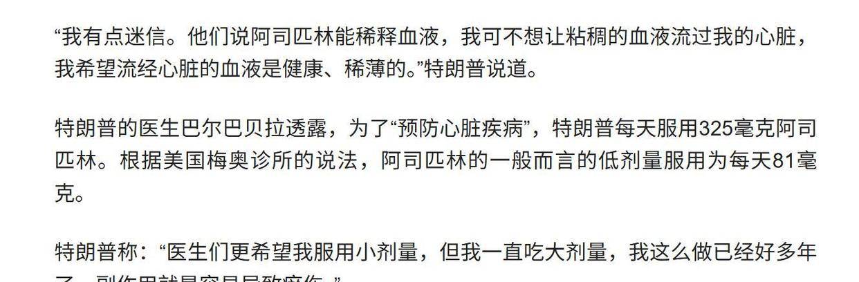白宫后来承认他每天服用325毫克阿司匹林,远超医学界推荐的81毫克低剂量标准。