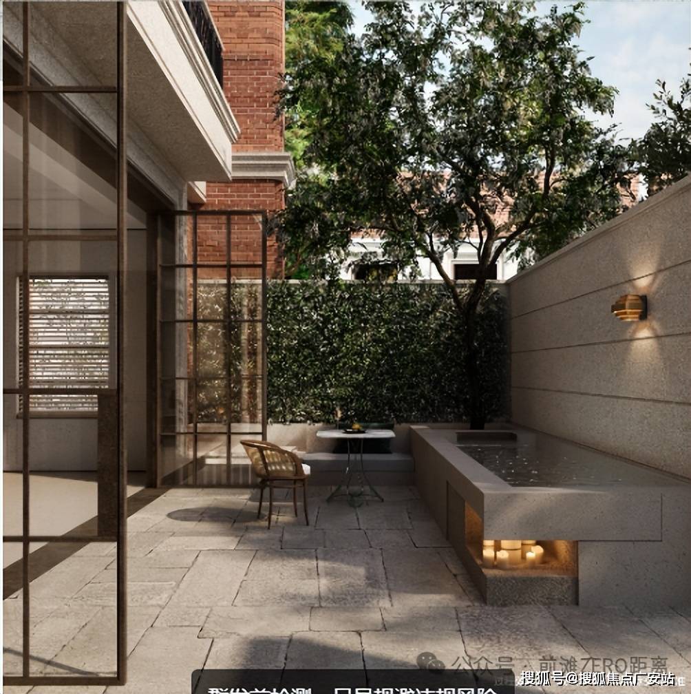 ,庭院的上下景观通过水帘相连通,中间结合有着层层叠水的水景,搭配水晶砖的景墙,将品质感拉满。