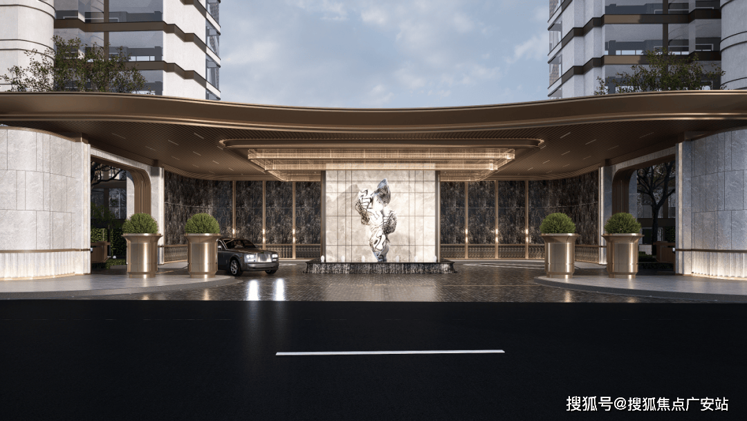 采用极细边,中间凿壁采用透光奢石,搭配极具现代主义的雕塑彰显小区档次,背景墙面采用维多利亚黑大理石,奢华且低调。