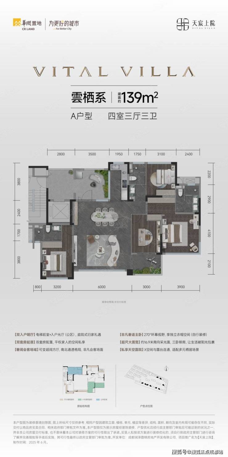 华润天宸上院位于成都市成华区崔家店南路,地处万象城东核心板块,由华润置地打造,物业为华润万象生活。项目总占地约72亩,容积率2.0,绿化率30%,总户数581户,涵盖建面约139-175㎡的小高层和199-235㎡的叠拼别墅,精装交付并配备三大件,得房率超124%,交房时间为2027年9月。